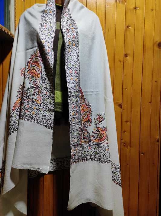 Semi Pashmina Kashmiri Shawl White, Full Embroidery Work