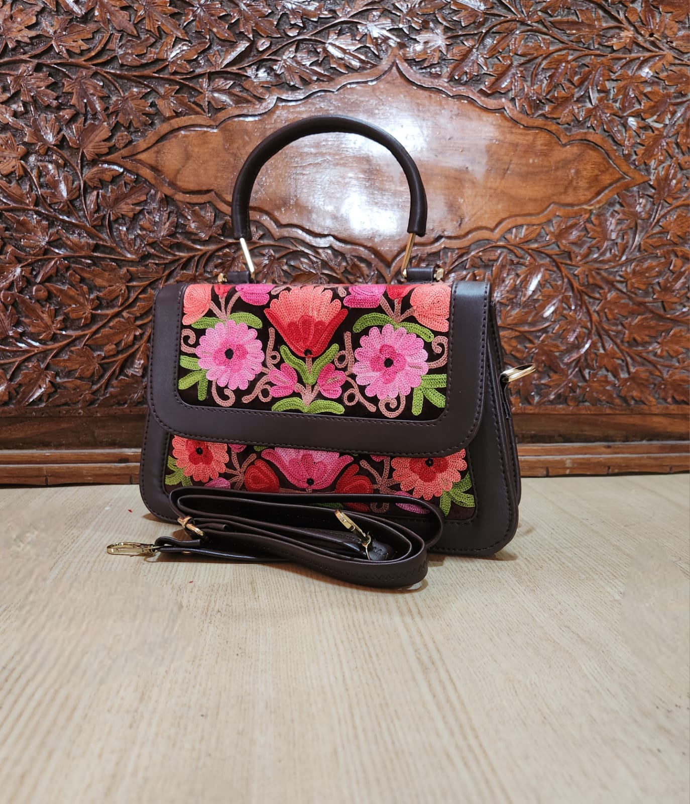 - Aari Embroidery: The handbag features intricate Aari embroidery, a traditional Kashmiri needlework technique known for its fine detailing and precision. The skilled artisans have embellished the bag with delicate floral patterns, creating a mesmerizing visual appeal.