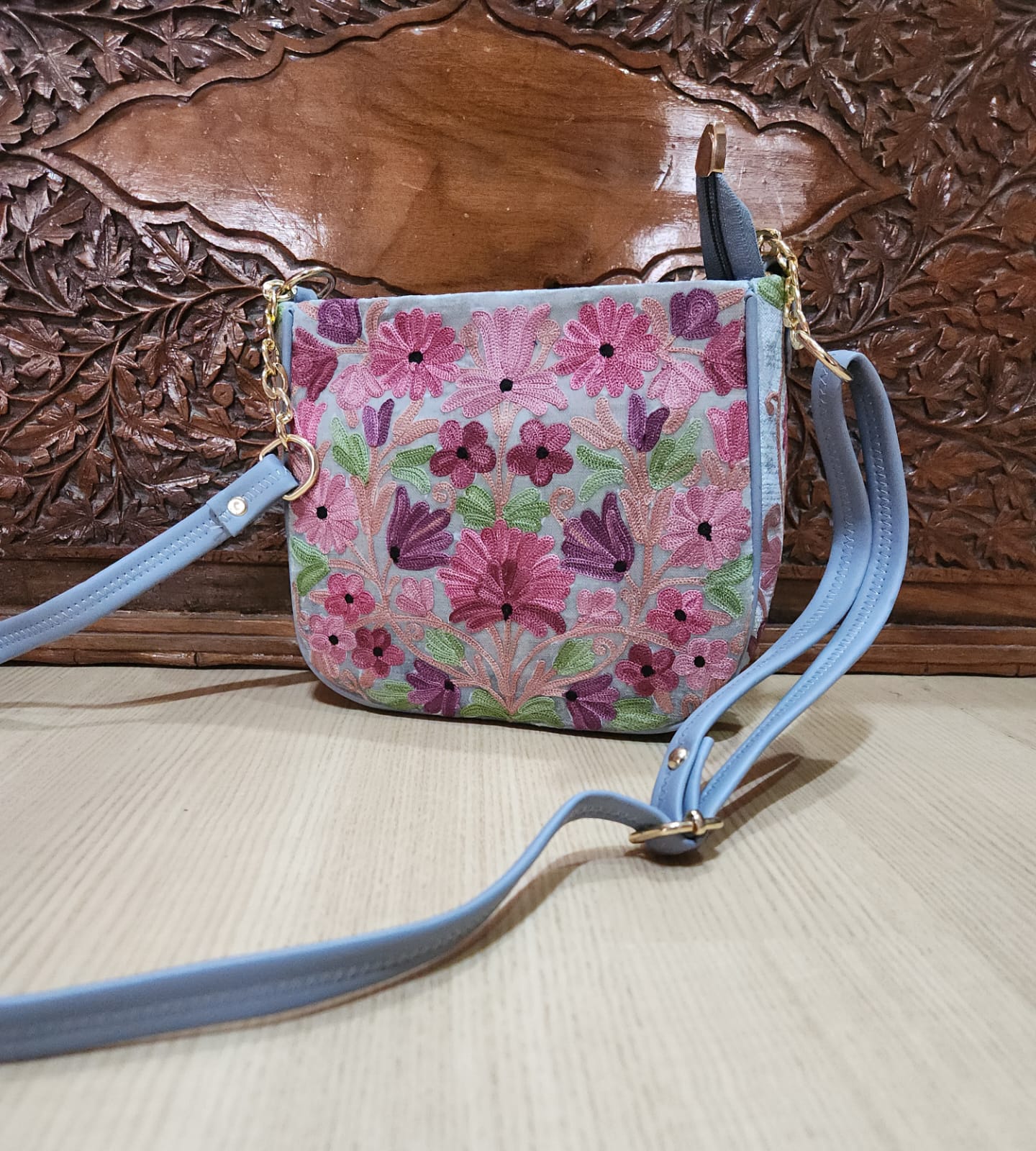 Kashmiri Aari Embroidery Suede Designer Handmade Handbag shoulder strap in upturned leather.
