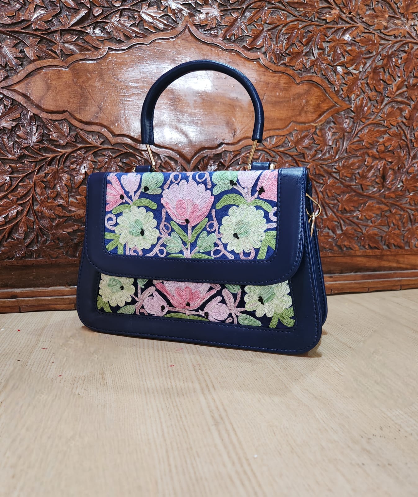 \n\n#Leather bag, Embroidery of Kashmir. \n \nNew stock and designs. \nFlap sling with elegant Ariwork available in stock \n \n