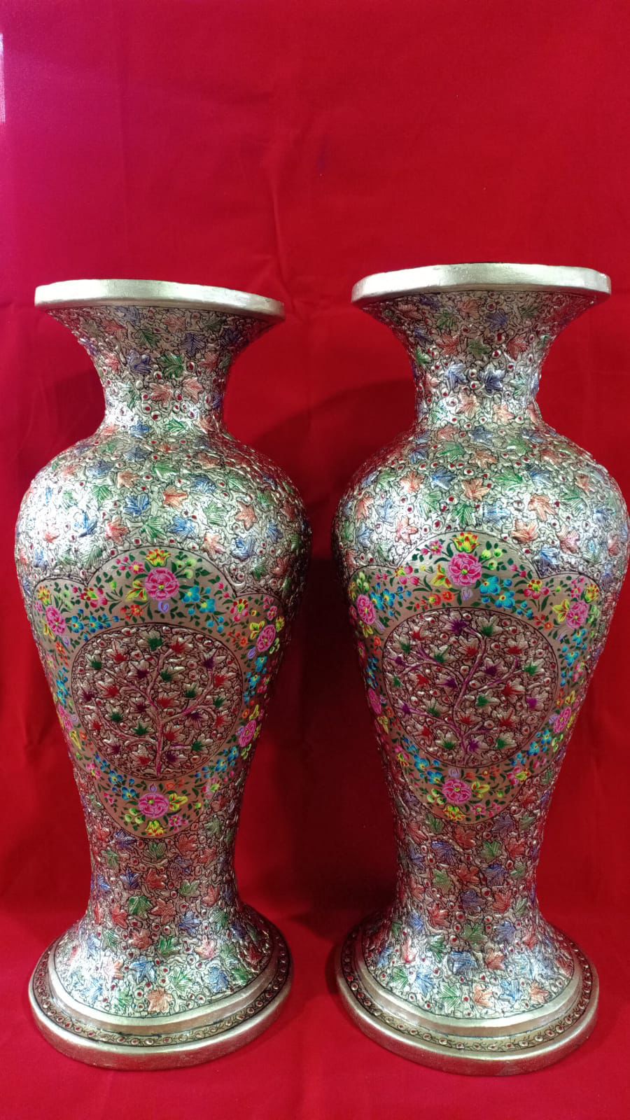 Each vase is meticulously handcrafted by skilled Kashmiri artisans using age-old papier mâché techniques. The intricate floral motifs are hand-painted with vibrant detail, reflecting the rich cultural heritage of Kashmir. -