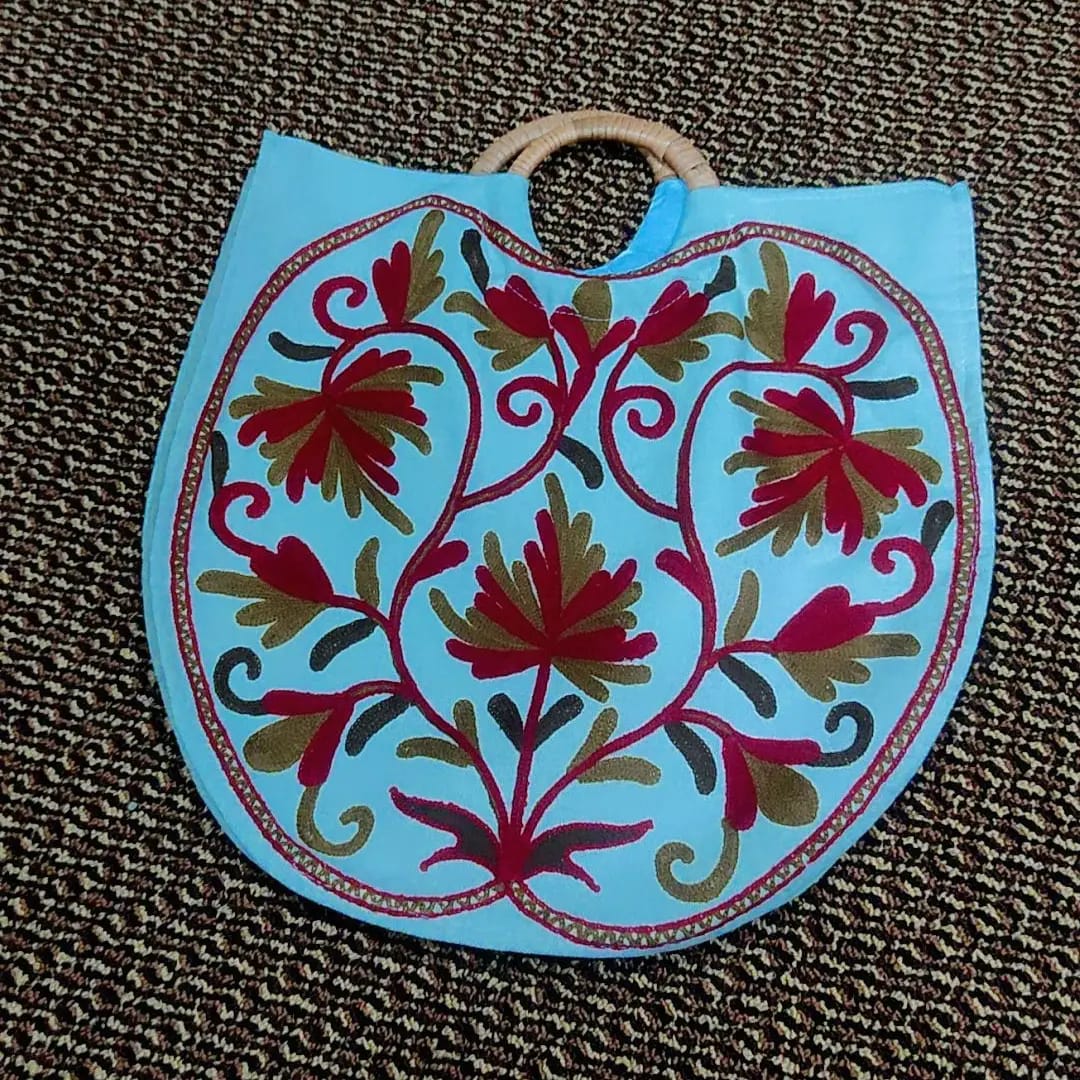 Each bag showcases fine hand-done Aariwork (Crewel embroidery), a centuries-old Kashmiri craft known for its rich floral and paisley motifs. -