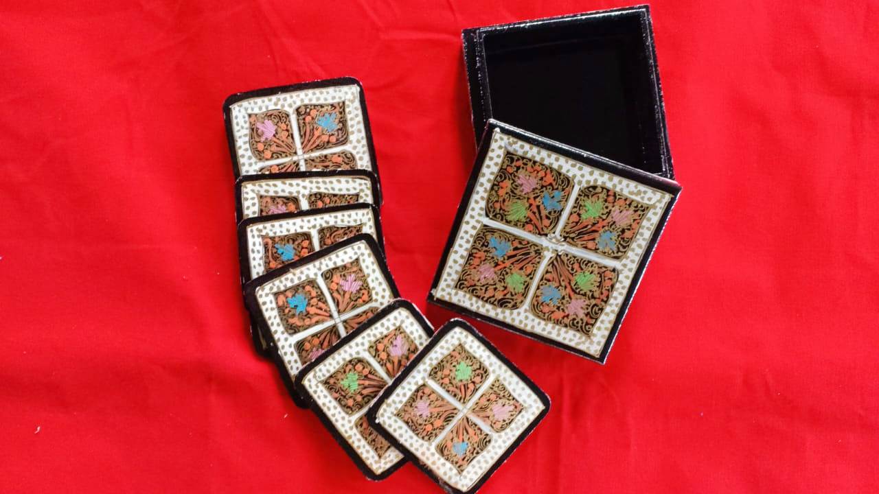 Bring elegance to your table with our handcrafted Papier Mâché Coasters Set in Box, a perfect blend of utility and Kashmiri artistry. Each coaster is hand-painted with delicate floral and traditional motifs, sealed with a glossy finish for durability. The set comes beautifully packed in a matching Papier Mâché box, making it both functional and decorative.