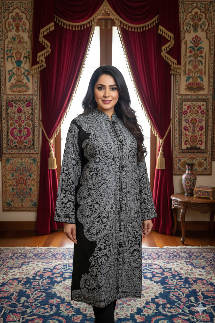 Intricate Kashmiri Ari Embroidery: Delicate hand-stitched designs on the full back and attached lining, showcasing rich Kashmiri heritage.