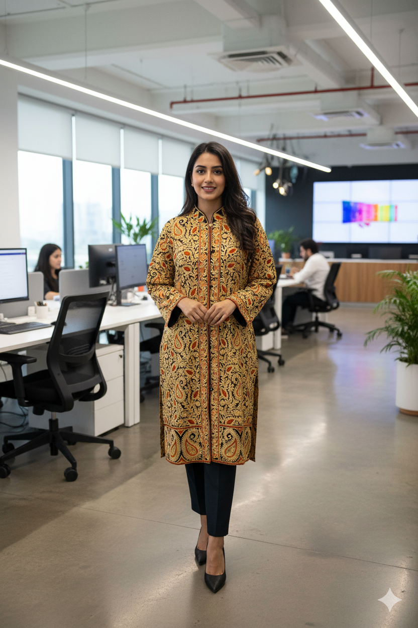 Intricate Kashmiri Ari Embroidery: Delicate hand-stitched designs on the full back and attached lining, showcasing rich Kashmiri heritage.