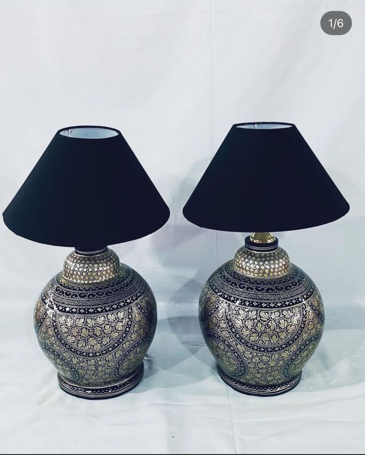 Bring the timeless artistry of Kashmir into your home. This pair of papier-mâché bedside lamps is handcrafted and hand-painted by skilled Kashmiri artisans, making every piece truly unique.